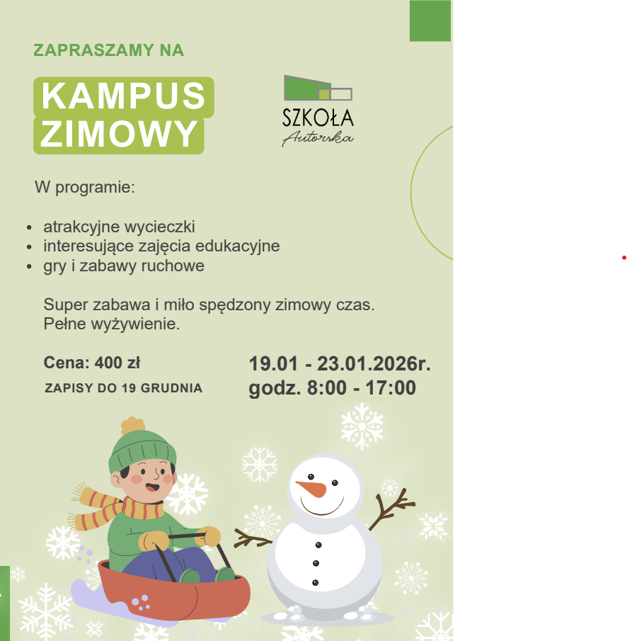 Przypominamy, że w pierwszym tygodniu ferii zimowych (19 ...Czytaj więcejPrzejdź do pełnej zawartości artykułu: Kampus zimowy – Zima w Autorskiej -